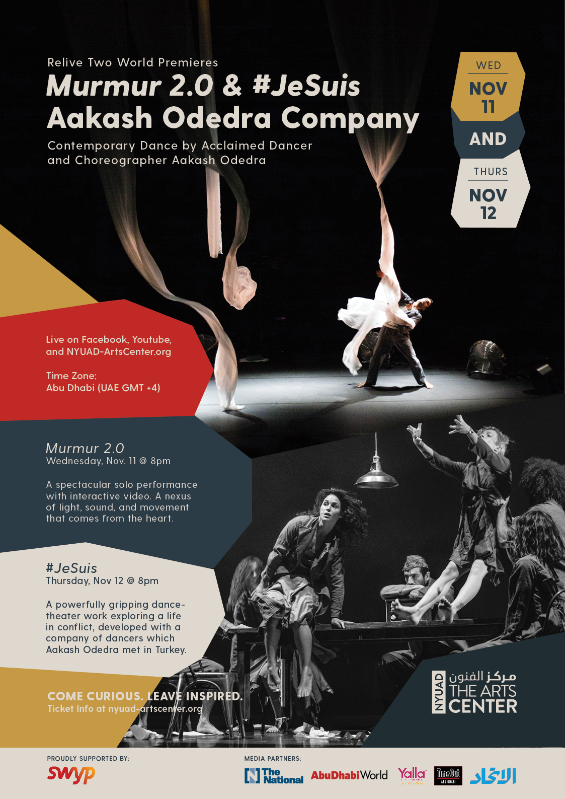 The choreographer of both performances, the acclaimed British dancer Aakash Odedra, has a long-term relationship with NYUAD. We spoke with Bill Bragin, the executive artistic director of the Arts Center at NYU Abu Dhabi, about this collaboration, and prepared our comments on and impressions of the upcoming performances MURMUR 2.0 and #JeSuis.