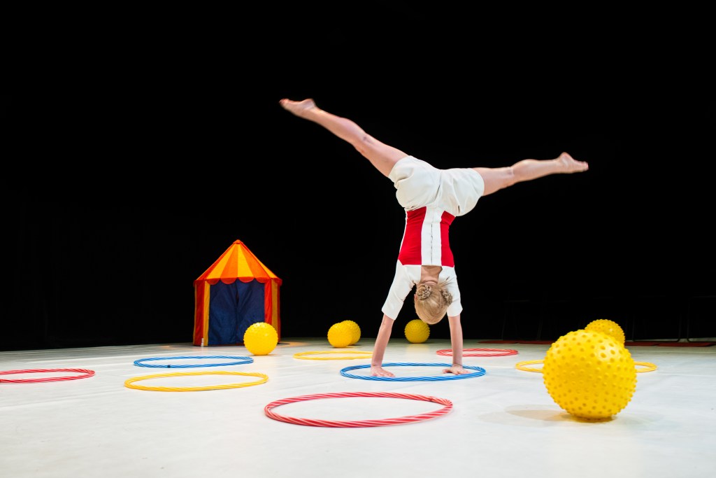 In 2016, Colourful Games was also presented in Edinburgh. In the daily The Times, critic Donald Hutera writes that, “Part of the pleasure of Colourful Games is watching little kids having what may well be their first immersive theatrical experience. Lasting for a relaxed minutes, this simple but sweet performance presents movement in a circus context. Giedre Subotinaite, a dancer with a lovely presence, uses a variety of big top-themed props – from a small tent out of which her legs can pop, to ribbons, hoops, red noses and balls – to attract an audience of tykes and the adults accompanying them.”